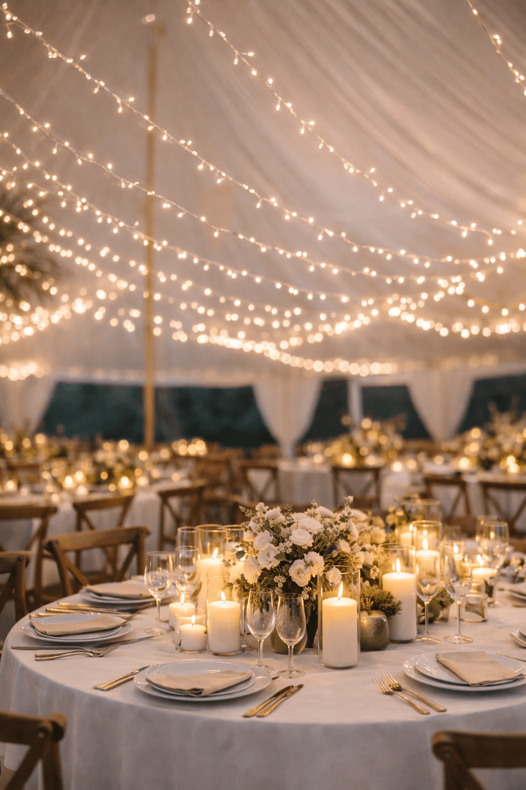Besonders über runden Gästetischen oder langen Tafeln wird der Lichterkettenhimmel zum stilvollen Highlight des Abends.