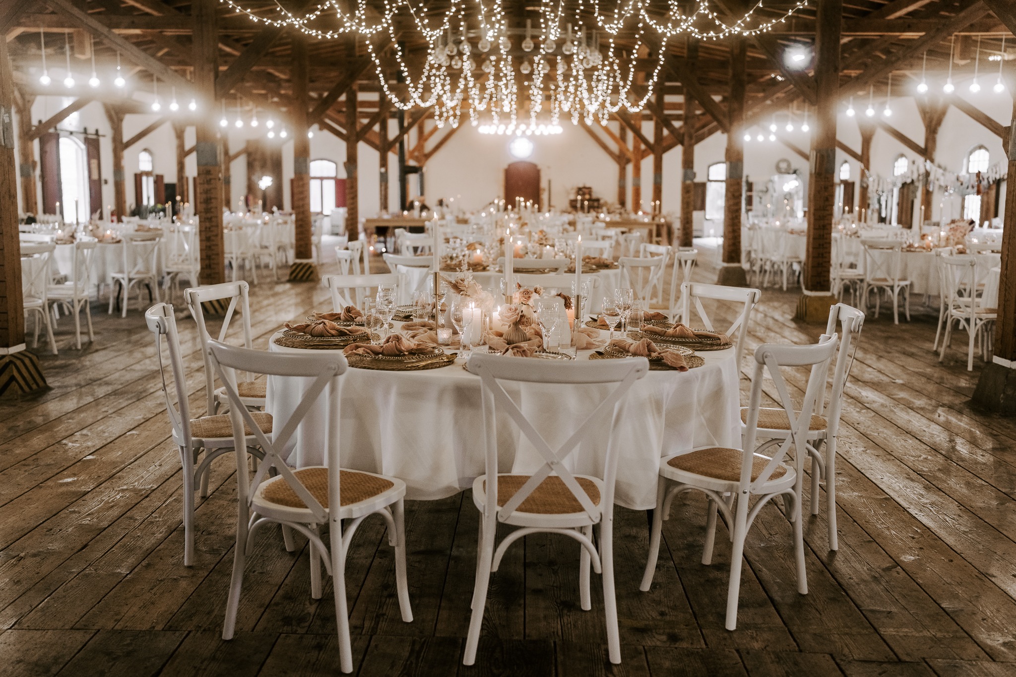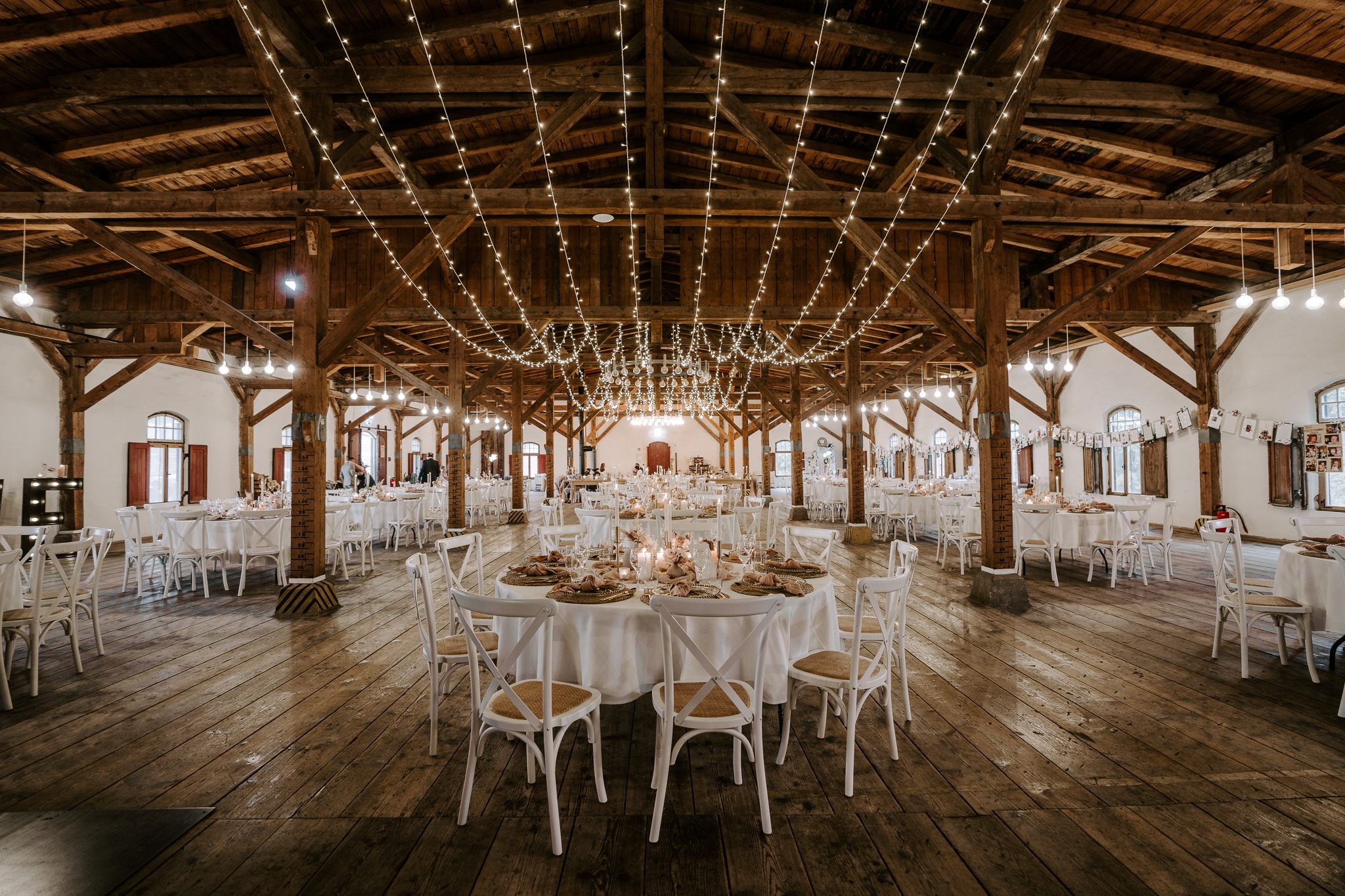 Unser Lichterkettenhimmel eignet sich ideal für Scheunen, Eventhallen, Zelte oder Locations mit hoher Decke. Auch wenn vor Ort keine festen Befestigungsmöglichkeiten vorhanden sind, kann die Installation flexibel umgesetzt werden. So entsteht eine gleichmäßige, schwebende Lichtfläche mit beeindruckender Wirkung.